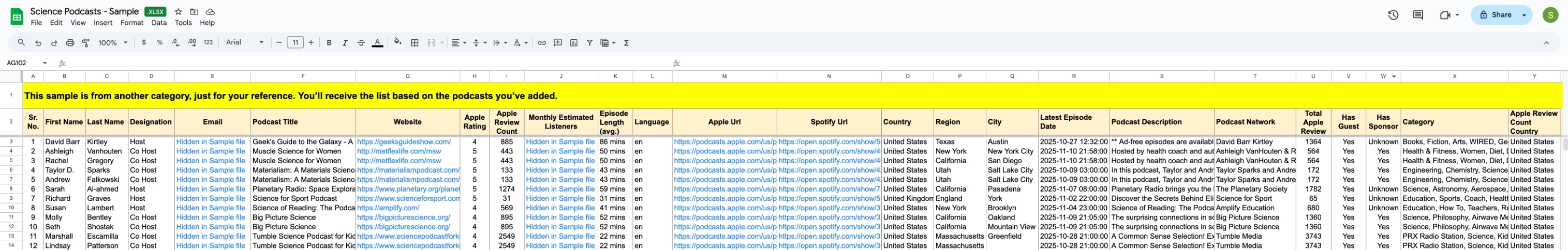 You'll receive podcasts in an excel spreadsheet or csv file. We'll share the following data for each podcast